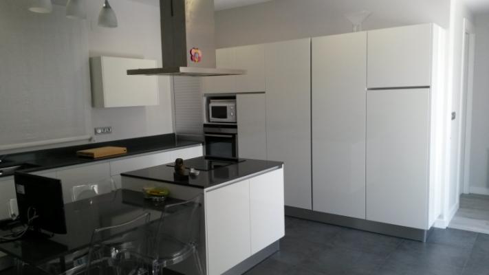 Cocina modelo Complet Luxe, color blanco brillo, sin tirador, módulos en blanco, y herrajes Blum.